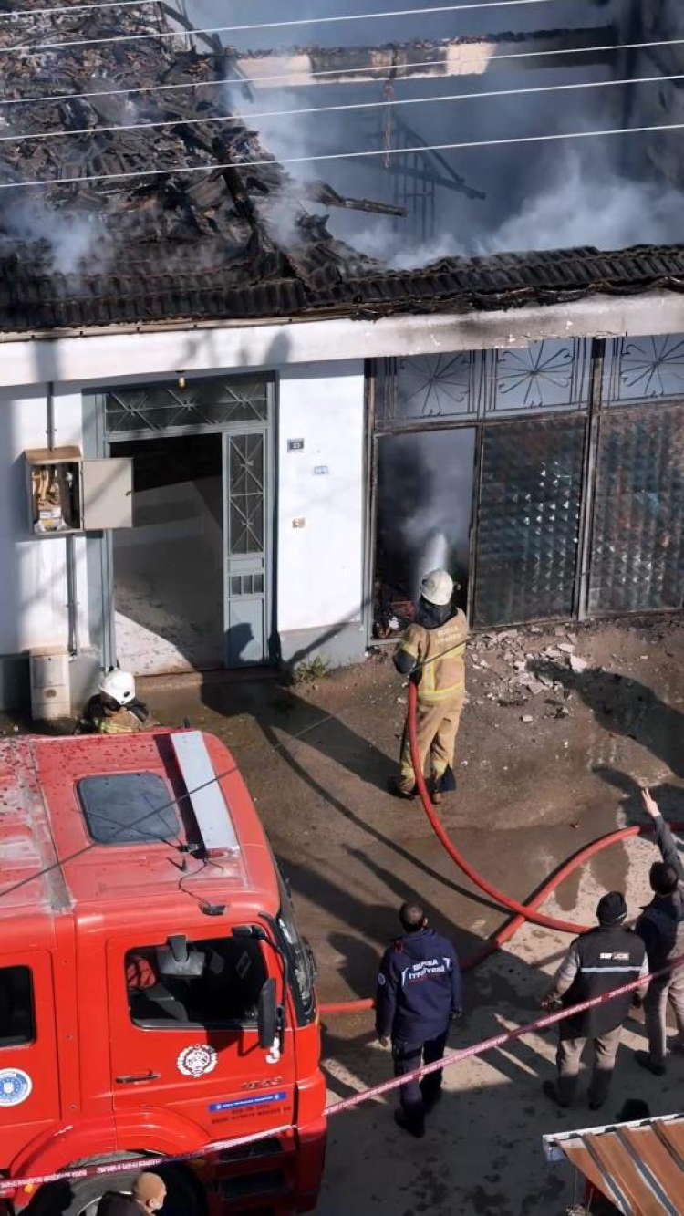 Bursa'nın İnegöl ilçesinde tek katlı ev alev alev yandı. Yangın ve söndürme anları havadan görüntülendi.