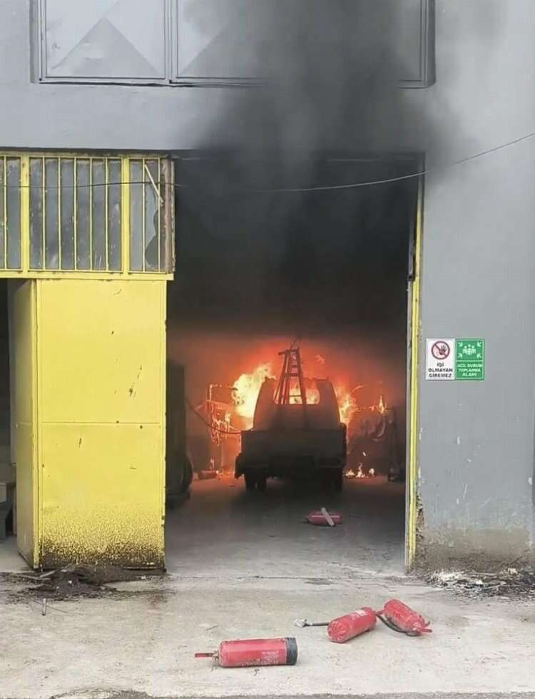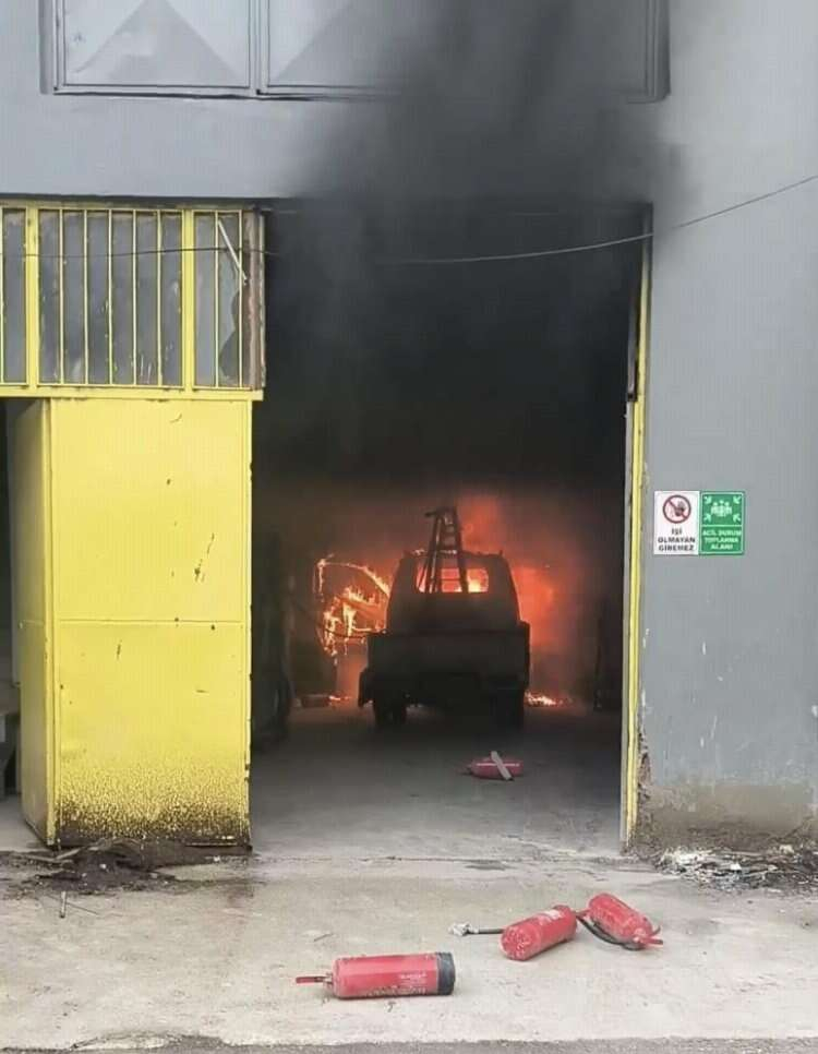 Bursa'nın İnegöl Mahmudiye Mahallesi'nde faaliyet gösteren cam imalathanesinde yangın çıktı. İmalathane içindeki kamyonet alev alev yandı.