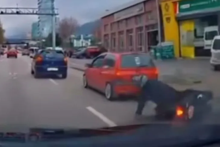Bursa'da seyir halindeki motosikletli sürücü önündeki araca çarpmamak için ani manevra yapınca kontrolünü kaybedip yere düştü. Kaza anı kameraya anbean yansıdı.
