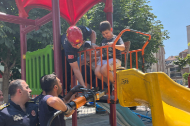 Bursa'nın İnegöl ilçesinde karnesini aldıktan sonra arkadaşlarıyla parkta oyun oynarken korkuluklara sıkışan çocuk, mutlu gününde dehşeti yaşadı.