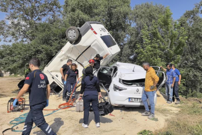 Bursa'nın İnegöl ilçesinde meydana gelen kazada otomobil ile çarpışan minibüs ters döndü. 2'si ağır 3 kişi yaralanırken, kaza yeri havadan görüntülendi. Sağlık ve kurtarma ekipleri zamanla yarışırken, ambulans görevlisinin otomobil sürücüne takılan serumu uzun süre havada tutarak akışını sağlaması dikkat çekti. Kaza anı da güvenlik kamerasına yansıdı.