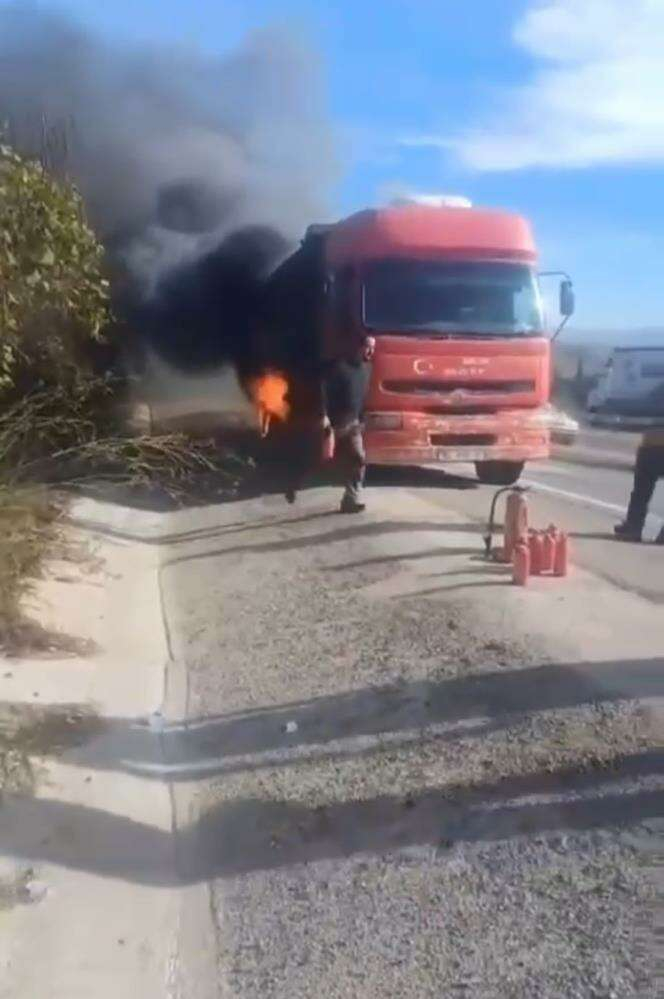 Bursa-İzmir Karayolu üzerinde bir kamyon seyir halindeyken alev alev yandı. Yangını gören herkes aracından yangın tüpünü kapıp müdahale etmeye çalıştı.