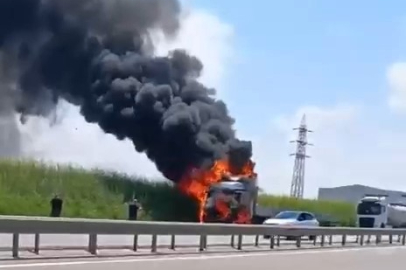 Olay, İzmir-Bursa yolunda meydana geldi. Edinilen bilgiye göre, Bursa'ya kilometreler kala dumanlar yükselen tırı yolun kenarına çeken sürücü, canını zor kurtardı. Tırdan inen sürücü, kendi imkanlarıyla yanan tırı söndürmeye çalışsa da mümkün olmadı.