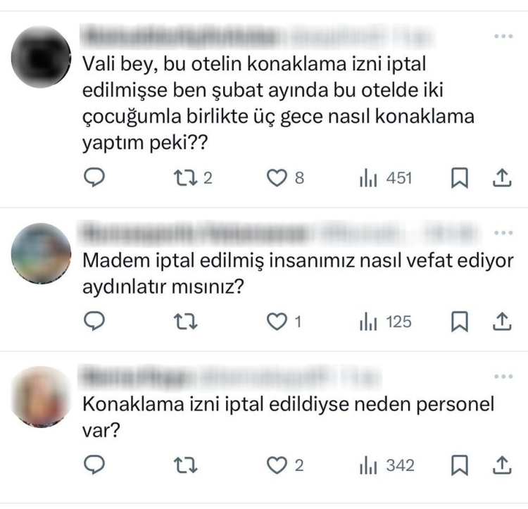 5 saatlik çalışmayla tamamen söndürülen otel ile ilgili yapılan açıklamalar ise dikkatlerden kaçmadı. Bursa Valiliği, otelin 2 Ocak 2025 tarihinde konaklama izninin iptal edildiğini açıklarken, aynı anlarda otel tarafından yapılan açıklama ise dikkat çekti. Kervansaray Otel yönetimi, 17 Mart'ta jandarmaya bilgi verilerek otelin kapatıldığını belirtti. Bursa Valiliği tarafından yapılan açıklamanın altına yapılan yorumlar ise şu şekilde oldu: "Sezon boyu otel açıktı. Gözümle görmesem inanacağım. Mart başı otelde hala misafir vardı. Madem iptal edilmiş insanımız nasıl vefat ediyor aydınlatır mısınız? Konaklama izni iptal edildiyse neden personel var? Bu otelin konaklama izni iptal edilmişse, ben Şubat ayında bu otelde iki çocuğumla birlikte üç gece nasıl konaklama yaptım peki?"