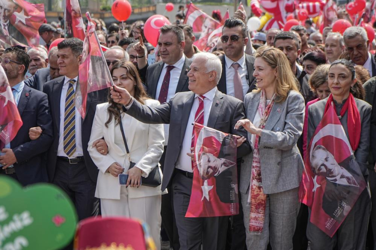 Altıparmak'tan kortej yürüyüşüyle başlayan programda çocuklar ellerinde Türk bayraklarını sallayarak Merinos Parkı'na kadar yürüdü.