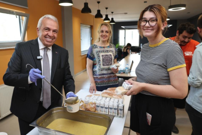 Başkan Şadi Özdemir, daha sonra çorba ve soğuk sandviç ikramında bulundu. Başkan Şadi Özdemir, doldurduğu çorba kaseleri tek tek öğrencilere vererek, “Afiyet olsun” dedi.