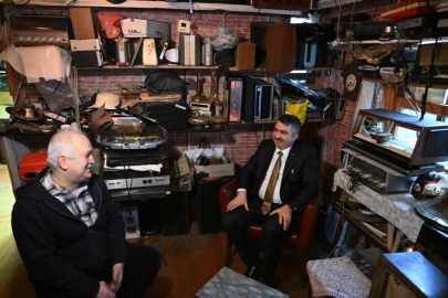 Yıldırım Belediye Başkanı Oktay Yılmaz, Bursa'da Yeşil Caddesi’ndeki atölyesinde 40 yıldır eski radyo ve gramofonları tamir edip çalışır hale getiren son usta 'Nostalji Doktoru' olarak tanınan Ahmet Ali Şağın’ın (63) misafiri oldu. Şağın ile sohbet eden Başkan Oktay Yılmaz, atölyede bulunan radyo, gramofon ve müzik dolaplarını inceledi.