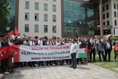 Bursa Teknik Üniversitesi öğrencileri, İsrail’in Filistin halkına yönelik aylardır düzenlediği saldırıları protesto etti. Mimar Sinan Yerleşkesi’nde kurdukları çadırlarda Filistin için nöbet tutan öğrenciler, protesto yürüyüşü de düzenledi.