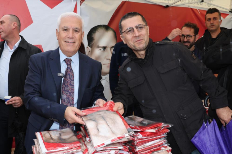 Yağmura rağmen poster dağıtım etkinliğine yoğun ilgi gösteren vatandaşlarla sohbet eden Başkan Mustafa Bozbey, Cumhuriyet’in en büyük ortak değer olduğunu vurgulayarak, "17 ilçemizde 60 bin civarında Ata posteri dağıtıyoruz.