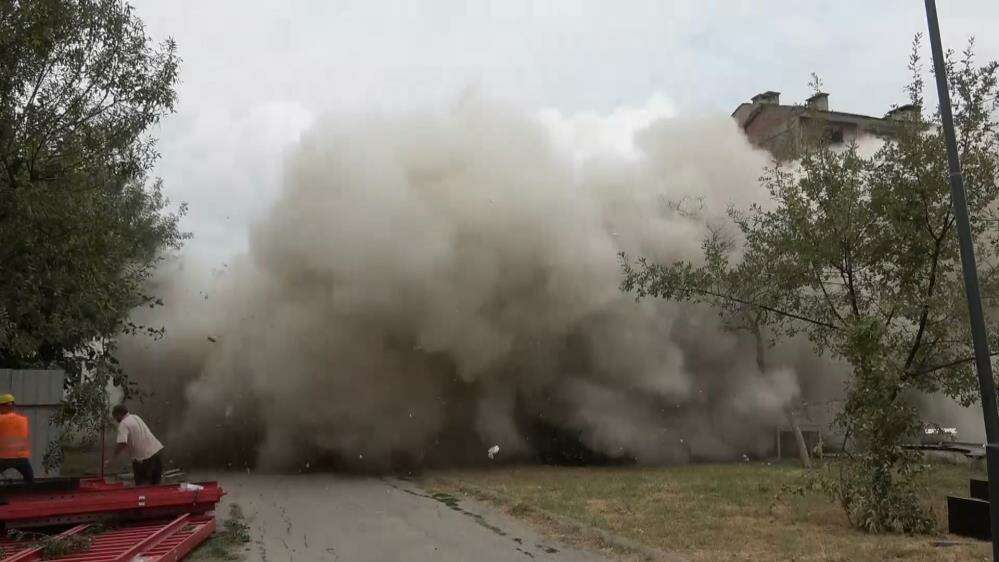 Bursa’da kentsel dönüşüm sebebiyle yıkılacak 5 katlı bina, Deprem yatak projesi için yerle bir oldu. Yıkılarak toz bulutuna dönen binanın zemin ve üçüncü katına yerleştirilen çelik konstrüksiyonlu yatak, enkazdan çıkarılarak dayanıklılığı raporlanacak.