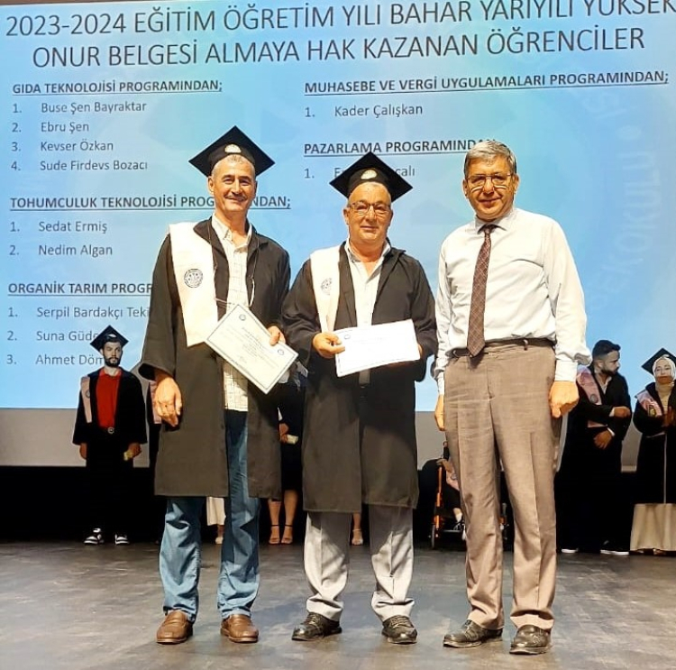 Yüksekokul birincisi Gıda Teknolojisi programından Buse Şenbayrakdar olurken, 40 yıllık zabıta memuru Nedim Algan da Tohumculuk Teknolojisi programını birincilikle bitirdi.