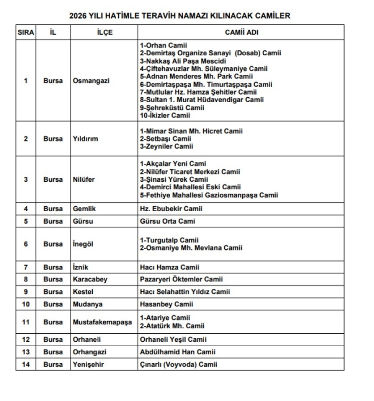 Bursa İl Müftülüğü, 2026 Ramazan ayı boyunca Bursa genelinde hatimle teravih namazı kılınacak camilerin listesini açıkladı. Açıklamaya göre, merkez ve ilçeler dâhil toplam 14 ilçede belirlenen camilerde teravih namazları hatimle eda edilecek.