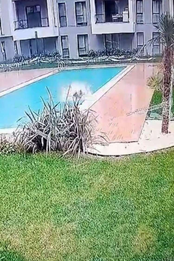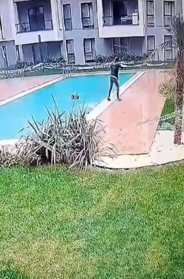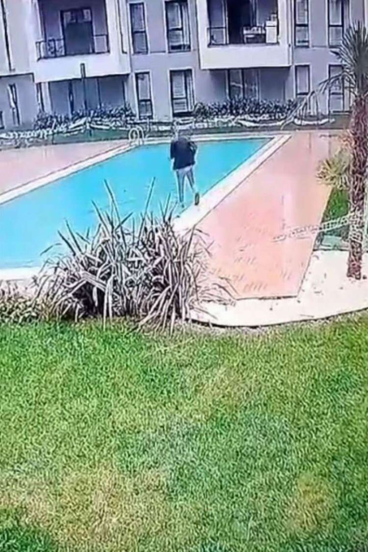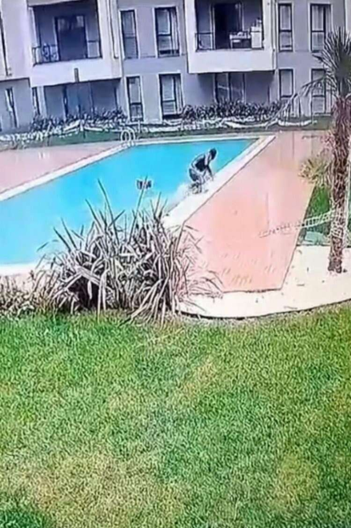 Kuryenin iş kazası sitenin güvenlik kamerasına an be an yansıdı. Görüntülerde kuryenin dalgın bir halde yürüdüğü, havuza düştüğü ve çıkmak için çaba sarfettiği kayda geçti.