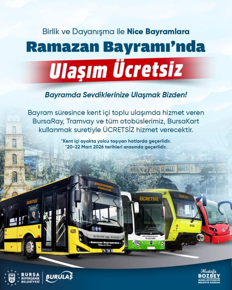 Ramazan ayının manevi iklimini düzenlediği programlarla tüm kentte hissettiren Bursa Büyükşehir Belediyesi, Ramazan Bayramı boyunca kent içi ulaşımın ve mezarlıklara ulaşımın ücretsiz olacağını açıkladı.