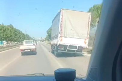 Bursa'da trafikte yan şekilde seyreden kamyon, zaman zaman devrilme tehlikesi atlattı. Diğer sürücüler gördükleri karşısında hayrete düştü.