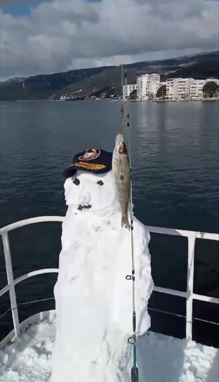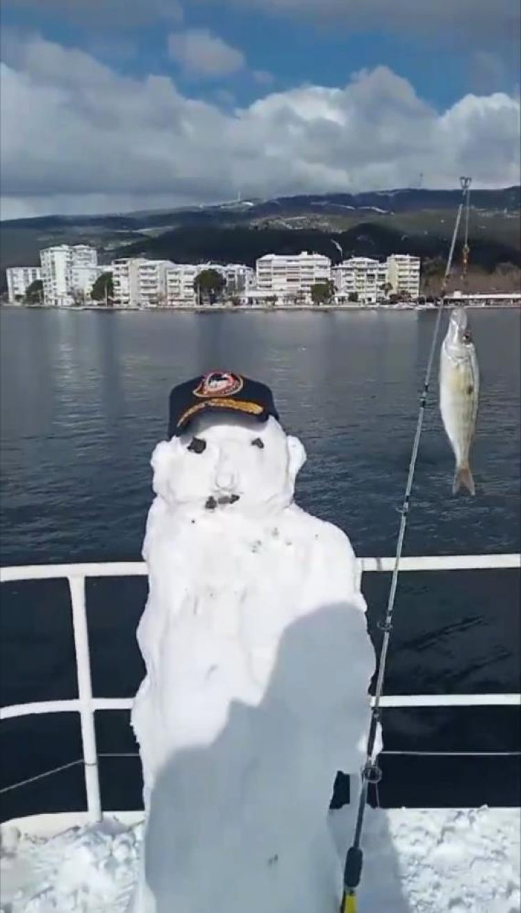 Gemlik ilçesinde denize açılan balıkçı grubu, balık tutmayı bırakarak teknede biriken karlar ile kardan adam yaptı. Yaptıkları kardan adama "Mülayim" adını veren balıkçılar; eline de olta ve balık koyup o anları ölümsüzleştirdi.