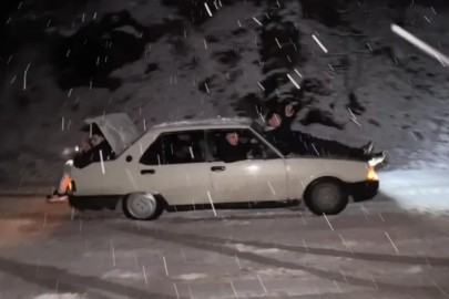 Bursa'da yazlık lastikle karda kalan araca insan takviyesi