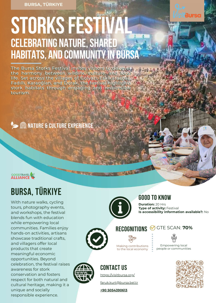 Bursa Büyükşehir Belediyesi’nin doğaya, kültüre ve topluma duyarlı turizm vizyonu sayesinde Bursa; Green Destinations Alliance tarafından hazırlanan Good Travel Experiences rehberinde yer aldı. Rehberde, Bursa’nın iki özgün etkinliği Bursa Leylek Şenliği ve Aktopraklık Arkeofest, “iyi seyahat deneyimleri” arasında gösterildi.