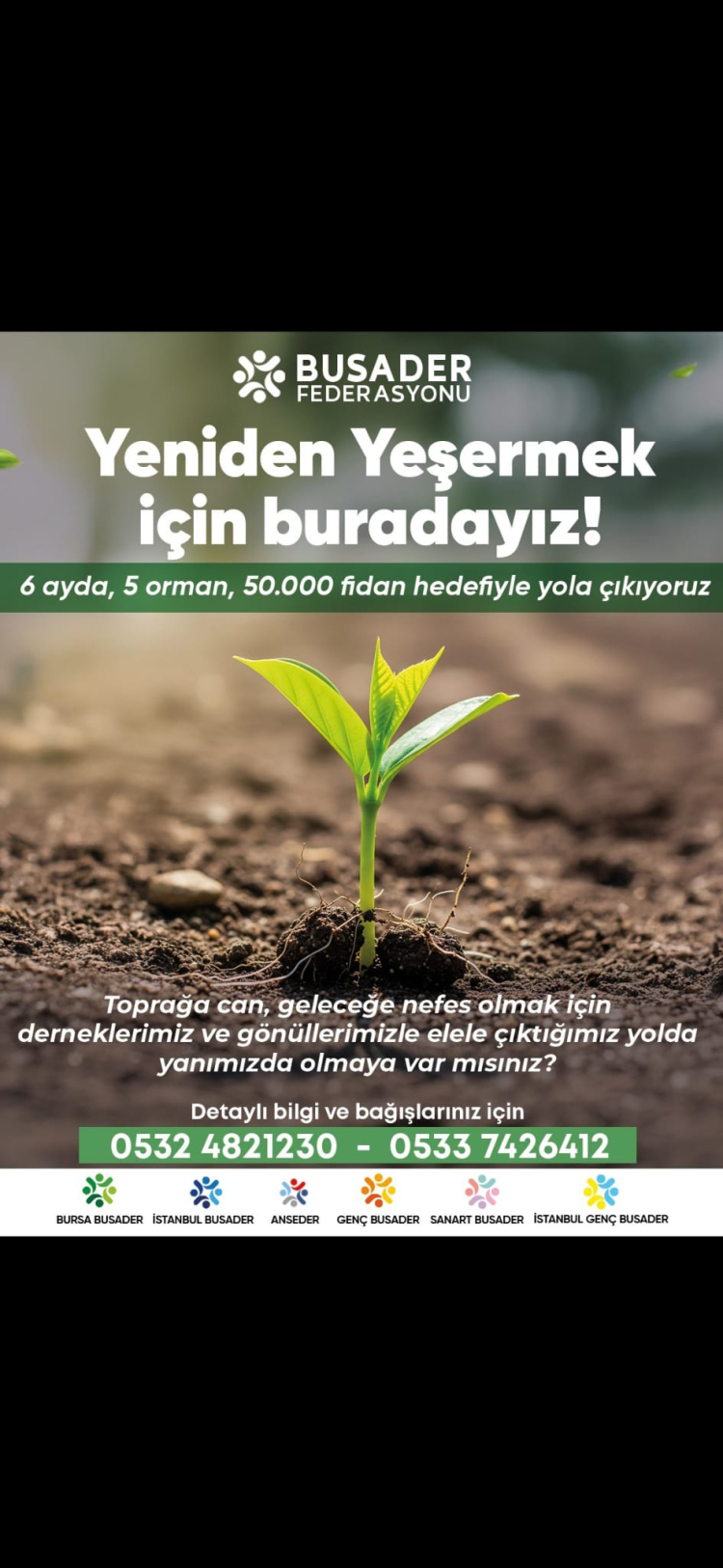 2024 - 2026 dönemi 2 yıllık programlarında ele aldıkları 'Sürdürülebilirlik' konusunda önemli çalışmalar yapan BUSADER Federasyonu “Yeniden Yeşermek İçin Buradayız” sloganıyla, 6 ayda 5 orman 50 bin fidan hedefiyle yola çıktı. Federasyona bağlı tüm derneklerin aktif şekilde yer alacağı ağaçlandırma kampanyası ile ilk orman, yangınlardan çokça etkilenen Bursa’da gerçekleştirilecek.