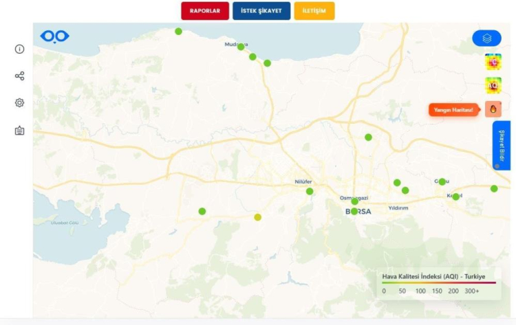 Bursa Büyükşehir Belediyesi, hava ve gürültü kirliliğinin tespiti için geçtiğimiz aylarda devreye aldığı hava kalitesi izleme sistemine yangın izleme sistemini de entegre etti. Bursa’daki ve Türkiye’deki tüm yangın noktalarını anlık olarak gösteren sistemi, Büyükşehir Belediyesi’nin internet sitesi üzerinden herkes kullanabilecek.
