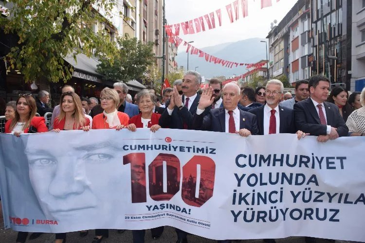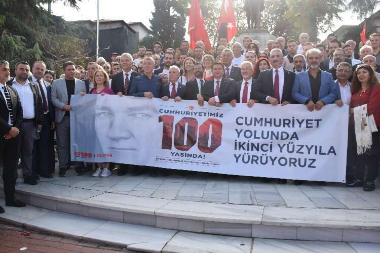 Cumhuriyet Halk Partisi Bursa İl Örgütü Cumhuriyetimizin 100’üncü yılını coşkuyla kutladı. Setbaşı’ndan Heykel Cumhuriyet Anıtı’na kadar gerçekleştirilen yürüyüşe İl Başkanı Nihat Yeşiltaş, CHP Bursa Milletvekili Kayıhan Pala, Bursa Büyükşehir Belediye Başkan Adayı Mustafa Bozbey, Nilüfer Belediye Başkanı Turgay Erdem, İl Yönetim Kurulu Üyeleri, ilçe başkanları ve yönetimleri, Kadın ve Gençlik Kolları Başkanları ve yönetimleri katılırken binlerce Bursalıyla birlikte büyük coşku yaşandı.
