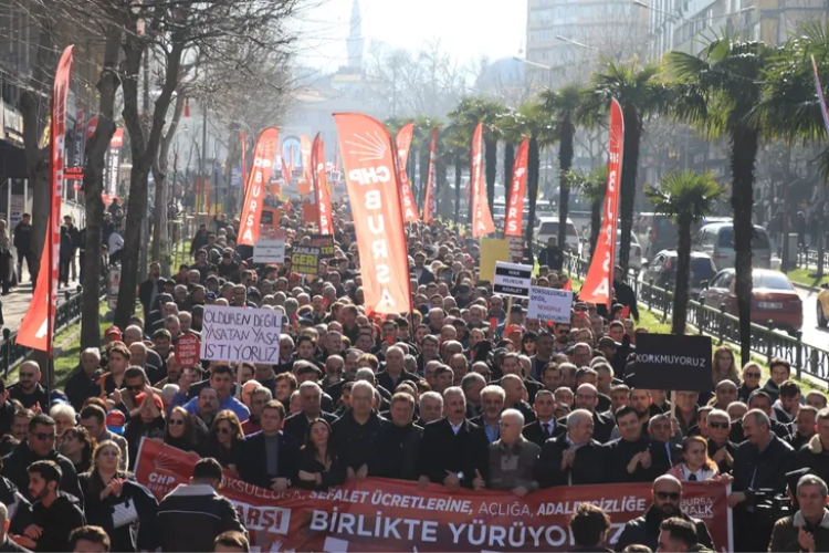 Cumhuriyet Halk Partisi Bursa İl Başkanlığı ve Bursa Halk Dayanışması binlerce yurttaşın katılımıyla açlığa, yoksulluğa, sefalet ücretlerine ve adaletsizliğe karşı yürüyüş ve basın açıklaması gerçekleştirdi. Basın açıklamasında konuşan CHP Bursa İl Başkanı Nihat Yeşiltaş, "Biz bundan sonra, omuz omuza, yürek yüreğe mücadele verip, bu güzel vatanı layık olduğu yere getireceğiz. Çünkü bizler, hırsızlığın alıp başını gittiği, çocukları ve gençleri umutsuz, kadınları korku içinde yaşayan, emekçisi sömürülen, kentleri yoksullukla boğuşan bir düzeni asla hak etmiyoruz" dedi.