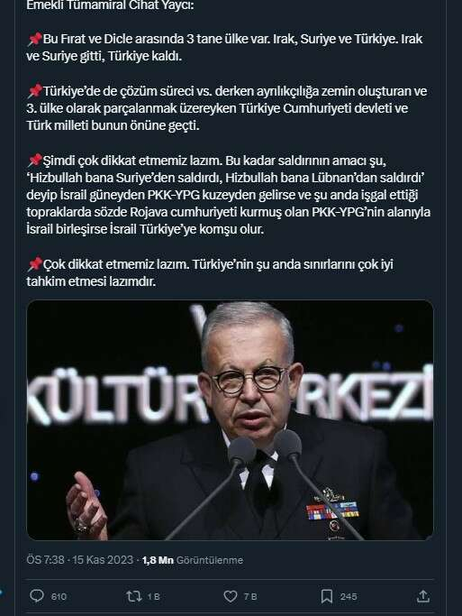Emekli Tümamiral Cihat Yaycı, İsrail-Filistin savaşıyla ilgili önemli bir bilgi paylaştı, "Hedef Fırat ve Dicle arasında 3 tane ülke" olduğunu söyledi.