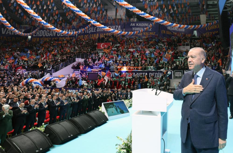 Erdoğan, AK Parti siyasetinin hizmet ve eser siyaseti olduğunu belirterek, "Bizim siyasetimiz millete karşı dürüst şeffaf olma siyasetidir. Biz de tüm meşakkate rağmen sadece bunu yapmaya çalışıyoruz. Türkiye ve Türk milletine borcumuzu layıkıyla ödemenin derdindeyiz. Partimize ittifakımıza ve iktidarımıza güvenen bu aziz millete hayal kırıklığı yaşatmak istemiyoruz. Günübirlik hesaplar, ülkemizin yakın geçmişinde bu millete çok vakit ve nakit kaybettirdi. Kim ne veriyorsa benden 5 fazlası anlayışı geçmişte Türkiye’ye çok ağır bedeller ödettirdi. Sırf günü kurtarmak için verilen ancak sonra unutulan sözler hem bu ülkeye hem de siyaset kurumuna çok büyük zararlar verdi. Benden sonrası tufan diyenler geride telafisi yıllar sürecek enkaz bıraktılar. Hesap kitap yapmadan bol keseden vaat dağıtanlar arkalarında tamiri imkansız hasarlar bıraktılar. AK Parti olarak bu ucuz siyaseti 2002’den beri elimizin tersiyle ittik. Kendimiz bedel ödesek dahi millete ve ülkeye bedel ödettirmeyeceğiz dedik. Her şartta Türkiye için en iyisini yapacağız zor da olsa en doğru kararı alacağız dedik. Hamdolsun bu duruşumuzdan da şimdiye kadar taviz vermedik. Siyaset kurumuna güveni yeniden biz tesis ettik. Türkiye’nin asırlık sorunlarına çözüm yollarını biz geliştirdik. Ülkeyi küresel şoklara dirençli hale biz getirdik. Ulaştırmada konutta enerjide tarımda çalışma hayatında savunma sanayinde Türkiye tarihinin en büyük şahlanışını bizimle yaşadı. 22 yıl önce hayal dahi edilemeyen büyük dönüşümleri büyük reformları ülkemizde biz gerçekleştirdik. Artık dünyada sözünün ağırlığı olan itibarı artan ay yıldızlı bayrağı başta komşuları olmak üzere tüm dünya için güven veren bir Türkiye var. Tüm bu söylediklerimi ve çok daha fazlasını hep yere sağlam basarak adımlarımızı sağlam atarak yaptık. Bugün de aynı prensipler çerçevesinde hareket ediyoruz. Şahsi çıkarlarımızı değil sadece 85 milyon vatandaşıyla tüm Türkiye’nin menfaatini düşünüyoruz. ,
