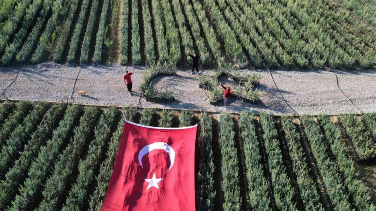 Bursa’nın İznik ilçesinde bir fidan işletmecisi Cumhuriyetin 101. yılını kutlamak için özel bir etkinliğe imza attı. İşletmeci Sinan Demircan, zeytin bahçesine dev Türk Bayrağı açtı, zeytin fidanlarıyla Türk Bayrağı'nın simgesi ay ve yıldızı oluşturdu.