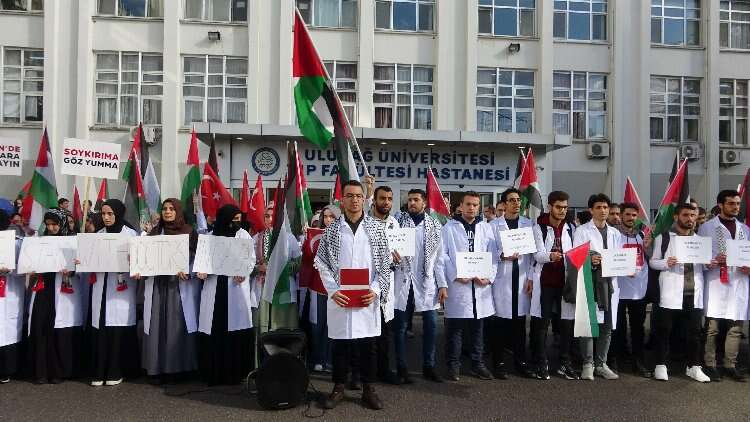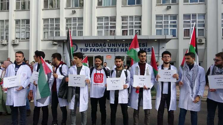 İsrail'in Gazze'ye yönelik saldırıları ve hastanelerin bombalanarak masum insanların şehit edilmesi Uludağ Üniversitesi Tıp Fakültesi öğrencileri, Uluslararası Doktorlar Derneği (AID) ve Sağlıkta İyilik Hareket Topluluğu öncülüğünde Uludağ Üniversitesi önündeki basın açıklamasıyla telin edildi