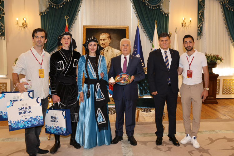 Bursa Büyükşehir Belediyesi tarafından bu yıl 37’ncisi düzenlenen Uluslararası Altın Karagöz Halk Dansları Yarışması’na katılan ekiplerin temsilcileri, Başkan Mustafa Bozbey’i ziyaret ederek ülkelerinin sembol hediyelerini sundu.
