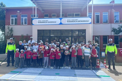 Bursa'nın Karacabey ilçesindeki Karakoca İlköğretim Okulu'nda, Trafik Haftası kapsamında çocuklara güvenli trafik eğitimi verildi.