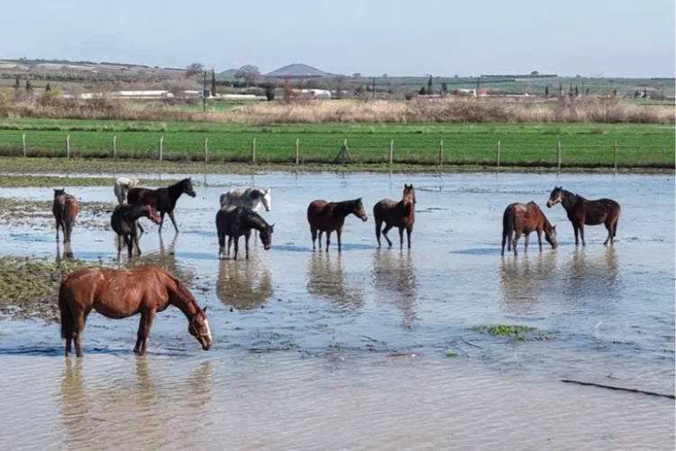Uluabat Gölü, Bursa-İzmir kara yolunun kıyısına kadar gelirken bölgede bulunan milyonluk yarış atlarının bulunduğu tarlalar da su altında kaldı. Arap ve İngiliz yarış atları, su içinde gezinirken drone ile görüntülendi. Milyonluk tayların annesi olan damızlık atların büyük kısmının gebe olması da dikkat çekti.