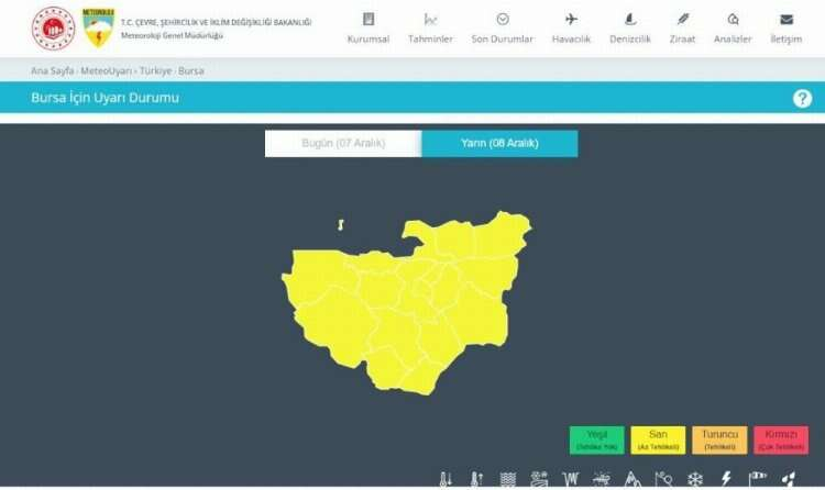 Meteoroloji Genel Müdürlüğü Bursa için sarı uyarıda bulundu.