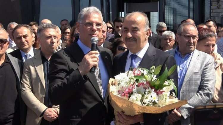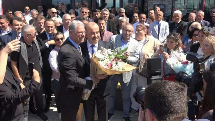 Konuşmaların ardından yeni ve eski belediye başkanları birbirlerine çiçek takdim etti.
