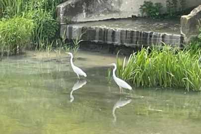Bursa'nın Nilüfer ilçesi merkezinden geçen Nilüfer Çayı'nda beslenen iki büyük ak balıkçıl, beslenirken görüntülendi.