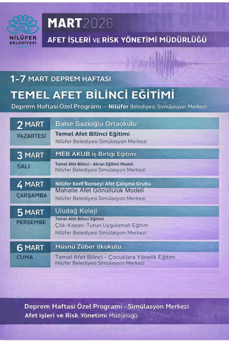 4 Mart Çarşamba günü Nilüfer Kent Konseyi Afet Çalışma Grubu’nun katılımıyla Mahalle Afet Gönüllülük Modeli’nin ele alınacağı eğitimlerde acil durum tahliye senaryoları da birebir simüle edilecek. 5 Mart Perşembe günü Uludağ Koleji öğrencilerine “Çök-Kapan-Tutun” uygulamalı eğitimi verilirken, haftanın kapanışı 6 Mart Cuma günü Hüsnü Züber İlkokulu öğrencileri için hazırlanan çocuklara yönelik özel afet farkındalık eğitimi ile yapılacak