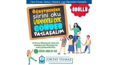 Koronavirüs salgınının yayılım hızını artırması nedeniyle yeni tedbirlerin alındığı dönemde interaktif etkinlikler gerçekleşerek önlemleri uygulayan Yıldırım Belediyesi, bu doğrultuda 24 Kasım Öğretmenler Günü için, hem öğrencileri hem de öğretmenlerini mutlu edecek organizasyona imza atıyor. Okul öncesi, ilkokul, ortaokul ve lise öğrencileri, öğretmenleri için seslendirecekleri şiirlerini videoya kaydedip adını, soyadını, eğitim gördüğü okulu ve sınıfını yazarak whatsapp uygulaması üzerinden 0530 488 91 83 numaralı Yıldırım Belediyesi Whatsapp Hattı’na iletecek. Yapılacak değerlendireler sonrasında öğrenciler Yıldırım Belediyesi tarafından ödüllendirilerek hediye çeki kazanacak.