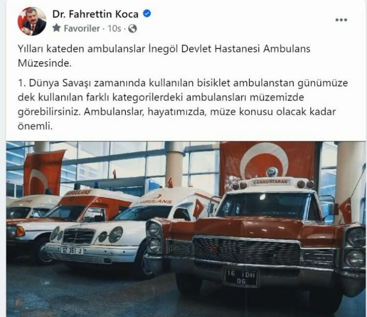Sağlık Bakanı Fahrettin Koca, Bursa İnegöl Devlet Hastanesi'nde bulunan Ambulans Müzesi’ni paylaşarak; “Ambulanslar, hayatımızda, müze konusu olacak kadar önemli.” ifadelerini kullandı.
