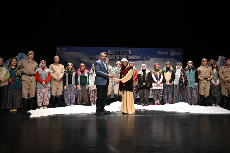 Başkan Yılmaz, tiyatro oyununa katılım gösteren tüm kursiyerlere ve ekibe teşekkür ederek, “Bu topraklarda yazılan destanlar, tarihe altın harflerle kazındı. Bugün, Yıldırım Belediyesi Sahne Sanatları Oyunculuk Atölyesi kursiyerlerimiz tarafından sahnelenen Sarıkamış Kardan Kefen adlı tiyatro oyunu, sadece bir tarih sahnesini değil, aynı zamanda bu milletin düşmanla nasıl mücadele ettiğini de bir kez daha gözler önüne serdi” dedi. Sanatın, bir milletin geçmişini hatırlatmak ve geleceğe doğru güçlü adımlar atmak için en güçlü araçlardan biri olduğunu kaydeden Başkan Yılmaz, “Bu anlamlı tiyatro oyununu hazırlayan Yıldırım Belediyesi Sahne Sanatları Atölyesi kursiyerlerimizi kutluyor, başarılarının devamını diliyorum. Böyle etkinliklerle tarihimize sahip çıkmaya ve gelecek nesillere aktarılmasına katkı sağlamaya devam edeceğiz” ifadelerini kullandı.