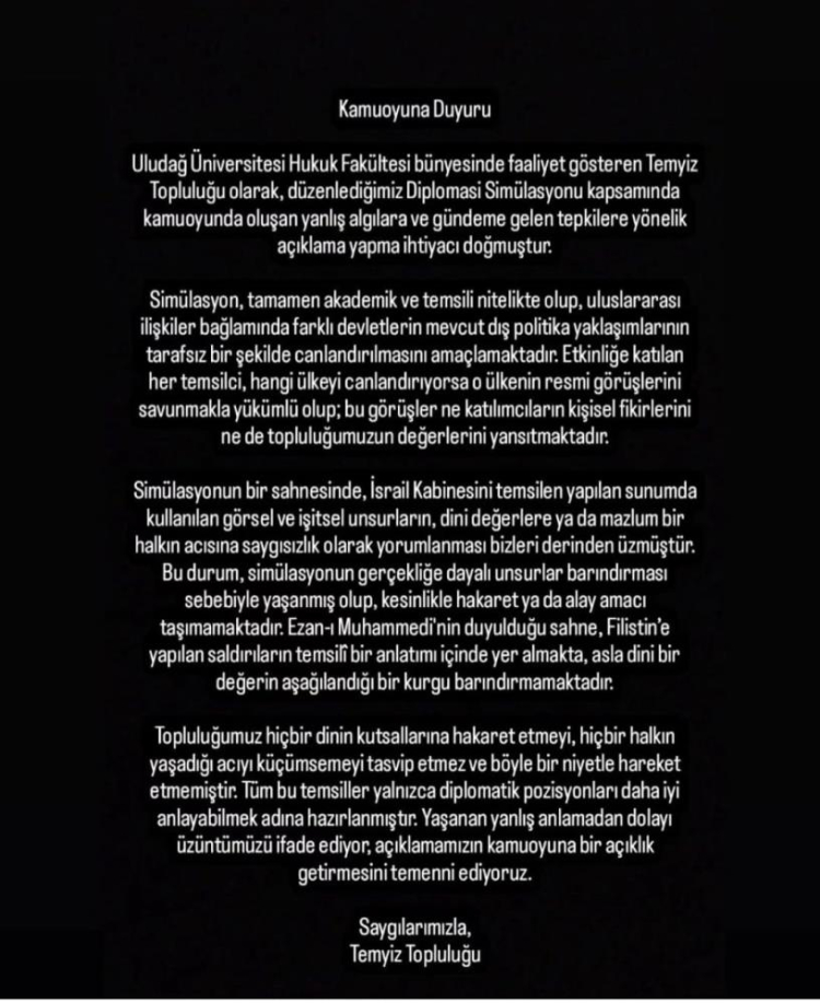 "Üniversitemiz Hukuk Fakültesi Temyiz Topluluğu öğrencilerinin düzenlediği Diplomasi Simülasyonu programı kapsamında gerçekleştirilen canlandırma anlarındaki görüntülerin düşüncesinden koparılarak sosyal medyada ağır ifadelerle dolaşıma girdiğini üzülerek takip ediyoruz. Simülasyonun bir sahnesinde, İsrail kabinesini temsilen yapılan sunumda gerçekliğe dayalı unsurlar barındırması sebebiyle Ezan-ı Muhammedi'nin duyulduğu esnada Filistin’de soykırım yaparken aşağılık bir şekilde umursamaz davranışlar sergileyen İsraillilerin tavırları yansıtılmaya çalışılmıştır. Bursa Uludağ Üniversitesi, Filistin Devletinin ve halkının her zaman yanında olmuştur. Bundan sonra da olmaya devam edecektir." Bursa Uludağ Üniversitesi Rektörlüğü ayrıca Temyiz Topluluğu öğrencilerin konuyla ilgili yapmış olduğu açıklamaya da şu şekilde paylaştı: