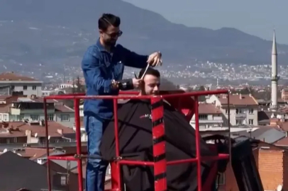 Bursa'da bir berber, müşterilerinin ilgisini çekebilmek için tuttuğu vincin kulesini kuaför salonuna çevirdi. Müşterilerini metrelerce yüksekte tıraş eden berberin o anları dronla görüntülenirken, görüntüler sosyal medyada viral oldu.