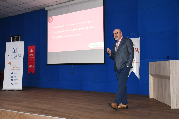 Yeşim Grup, “Meme Kanseri Farkındalık Ayı” kapsamında Hayat Hastanesi iş birliğiyle çalışanlarına yönelik bir seminer düzenledi. Büyük Konferans Salonu’nda gerçekleştirilen etkinlikte, Hayat Hastanesi Genel Cerrahi Uzmanı Servet Yetgin, meme kanserinin nedenleri, risk faktörleri ve tedavi yöntemleri hakkında katılımcılara önemli bilgiler sundu.