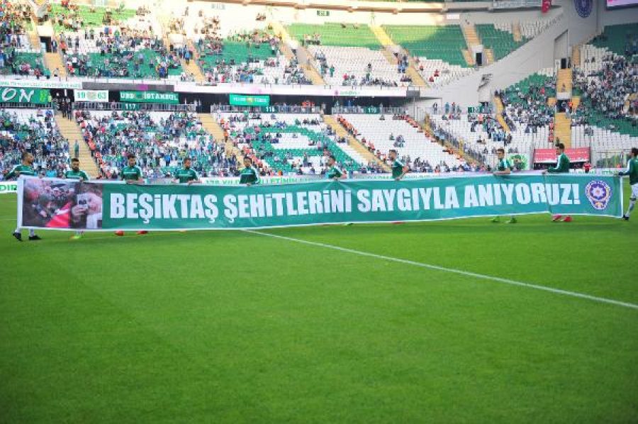 Geçtiğimiz yıl oynanan Beşiktaş-Bursaspor karşılaşması sonrasında yaşanan terör olayları nedeniyle bir çok polisin şehit olması nedeniyle, Bursasporlu taraftarlar sahaya ısınmaya, "BEŞİKTAŞ ŞEHİTLERİNİ SAYGIYLA ANIYORUZ" yazılı pankartla çıktı. Beşiktaş tribünleri de bu pankartı alkışladı.