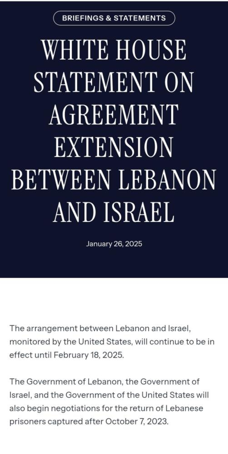 ABD hükümeti, Lübnan ve İsrail arasında varılan ateşkes anlaşmasının süresinin 18 Şubat 2025’e kadar uzatıldığını açıkladı.