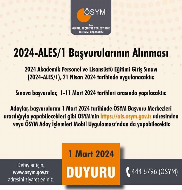 Ölçme, Seçme ve YerleştiÖlçme, Seçme ve Yerleştirme Merkezi (ÖSYM) Başkanlığından yapılan duyuruya göre, 2024-ALES/1 başvuruları başladı. Adaylar, başvurularını ÖSYM başvuru merkezleri aracılığıyla yapabilecekleri gibi ÖSYM'nin https://ais.osym.gov.tr adresinden veya ÖSYM aday işlemleri mobil uygulamasından da yapabilecek. Sınav ise 21 Nisan 2024’te gerçekleştirilecek.