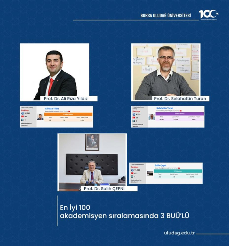 AD Bilimsel Endeksi, 12 ana akademik alanda ve 197 disiplinde, 219 ülkedeki 24.302 kurumu ve 2.400.388 bilim insanını analiz etti. Google Akademik'ten elde edilen ve birden fazla düzeyde veri filtrelemesine tabi tutulan çalışmada, toplam ve son 6 yılın h-indeksi, i10-indeks puanları ve atıf sayılarını dikkate alınarak bilim insanlarının verimlilik katsayıları kapsamlı bir şekilde değerlendirildi. Açıklanan listede BUÜ’de görev yapan Prof. Dr. Ali Rıza Yıldız, Prof. Dr. Salih Çepni ve Prof. Dr. Selahattin Turan’ın isimleri de yer aldı.