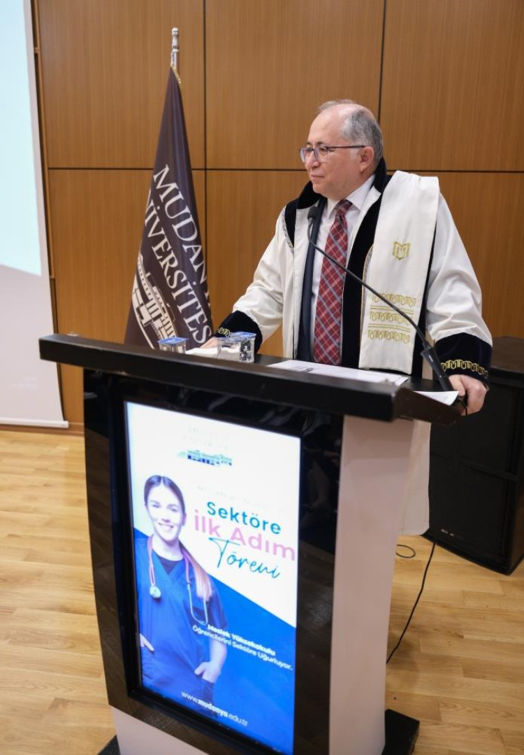 Danışma Kurulu Başkanı Prof. Dr. A. Saim Kılavuz ise, gençlerin geleceğim teminatı olduğunu vurgulayarak, "Bugün 3 dönem aldığınız teorik bilgileri tamamlayarak sahaya, görücüye çıkıyorsunuz. Geleceğinizi şekillendirecek bir dönem olacak. Atık hayatın içindesiniz. Sağlık sektöründe muhatabınız insan olacak. İnsana hizmetten daha değerli bir görev yoktur. Bu eğitimle mezun olduğunuzda uygulama donanımlarını edinmiş, birikimli gençler olarak hayata atılacaksınız. Hepinize başarılar diliyorum" ifadelerini kullandı.