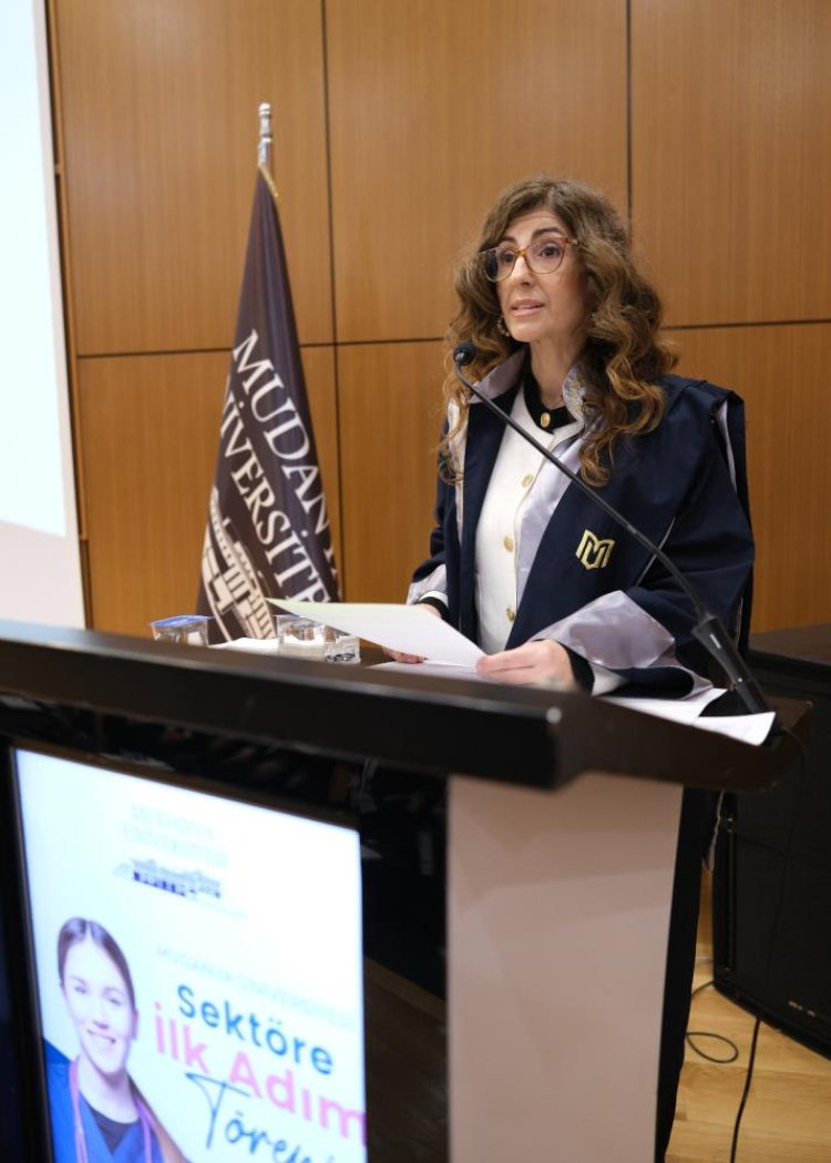 Törenin açılışında konuşan Meslek Yüksekokulu Müdürü Öğr. Gör. Esin Baylançiçek, öğrencilerin kariyerlerinde önemli bir aşamaya adım atacaklarını belirterek, "Üniversitemizden edindiğiniz teorik ve pratik bilgilerinizi, sektörde uzman kişilerin denetiminde yapacağınız uygulamalar ile birleştirerek bilgi ve becerilerinizi geliştirme imkanı bulacaksınız. Neyi ne kadar öğrendiğinizi göstereceğiniz er meydanına çıkıyorsunuz. Gittiğiniz kurumlarda Mudanya Üniversitesi öğrencisine yakışır bir şekilde bizi temsil edeceğinize yürekten inanıyorum. Gittiğiniz kurumlarda size destek olmak ve takip etmek üzere yanınızda olmaya devam edeceğiz. 14 hafta sonra mezuniyet keplerinizi fırlatmak için yine burada görüşmek dileği ile, yolunuz açık olsun" dedi.