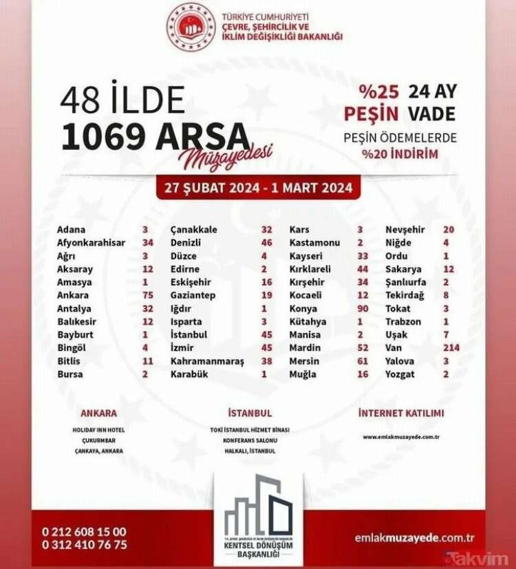 Çevre, Şehircilik ve İklim Değişikliği Bakanlığı, ülke genelindeki 48 farklı ilde bulunan toplamda 1069 muhtelif arsayı satışa sunuyor. Bu arsa satışları, 24 ay vadeli olarak gerçekleştirilecek ve alıcılarını 27, 28, 29 Şubat ve 1 Mart tarihlerinde bekliyor olacak.